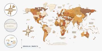 3D Wooden World Map is the perfect way to get our whole World on the wall of your room, hall, living room, office or cottage. Maps have always had their charm and they always attract people's attention. These breathtakingly large wall decorations feature layered wood panels. Combination of cutting, engraving and manual staining and glueing creates an original and valuable product. These techniques create an amazing 3D effect that will give life to any wall space and will please the heart and soul of any travel lover.