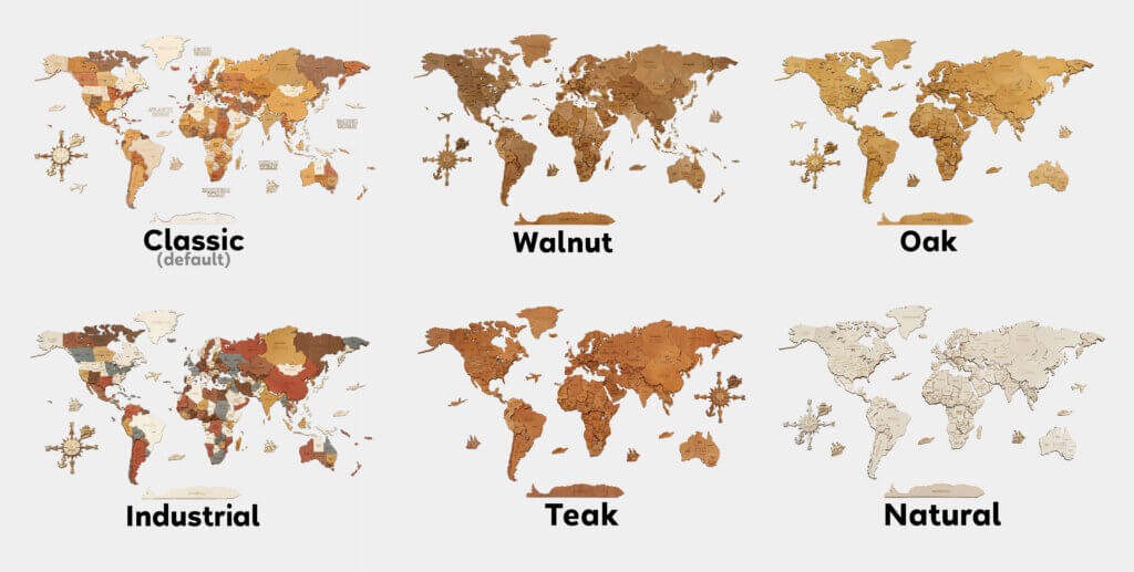 Classic multicolour in English language is the standard edition. When you purchase other wooden accessories like the Monuments and Landmarks or remote islands extension pack with the World map, they will be stained the same. All non-English language maps in non-standard colour combinations are a custom orders that may take an extra few days to ship out.