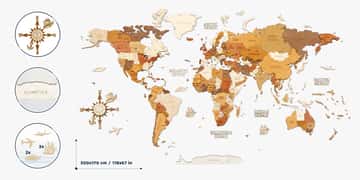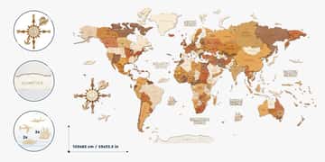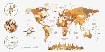 3D Wooden World Map is the perfect way to get our whole World on the wall of your room, hall, living room, office or cottage. Maps have always had their charm and they always attract people's attention. These breathtakingly large wall decorations feature layered wood panels. Combination of cutting, engraving and manual staining and glueing creates an original and valuable product. These techniques create an amazing 3D effect that will give life to any wall space and will please the heart and soul of any travel lover.